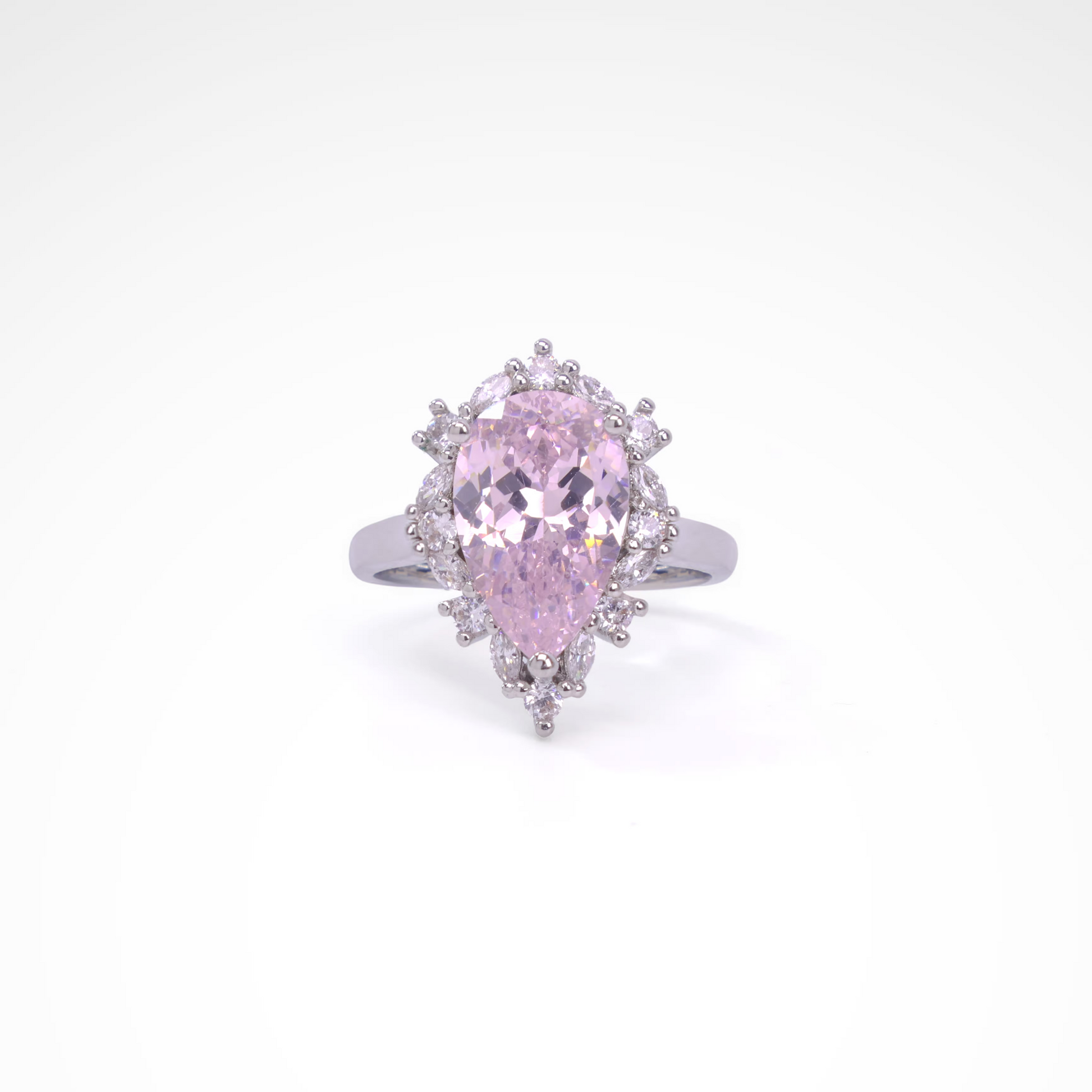 Indulge in the Blush Tiara Radiance Ring, inspired by the gentle shimmer of twilight petals, crafting a tale of romantic poise and opulent grace for the discerning woman. This elegant pink zircon ring presents a radiant pear-cut pink zircon centerpiece, framed by sparkling white zircon accents in a tiara-like halo, set in durable white gold-plated copper for lasting allure. Suited for weddings, festive events, or everyday refinement, it blends heritage artistry with modern splendor.