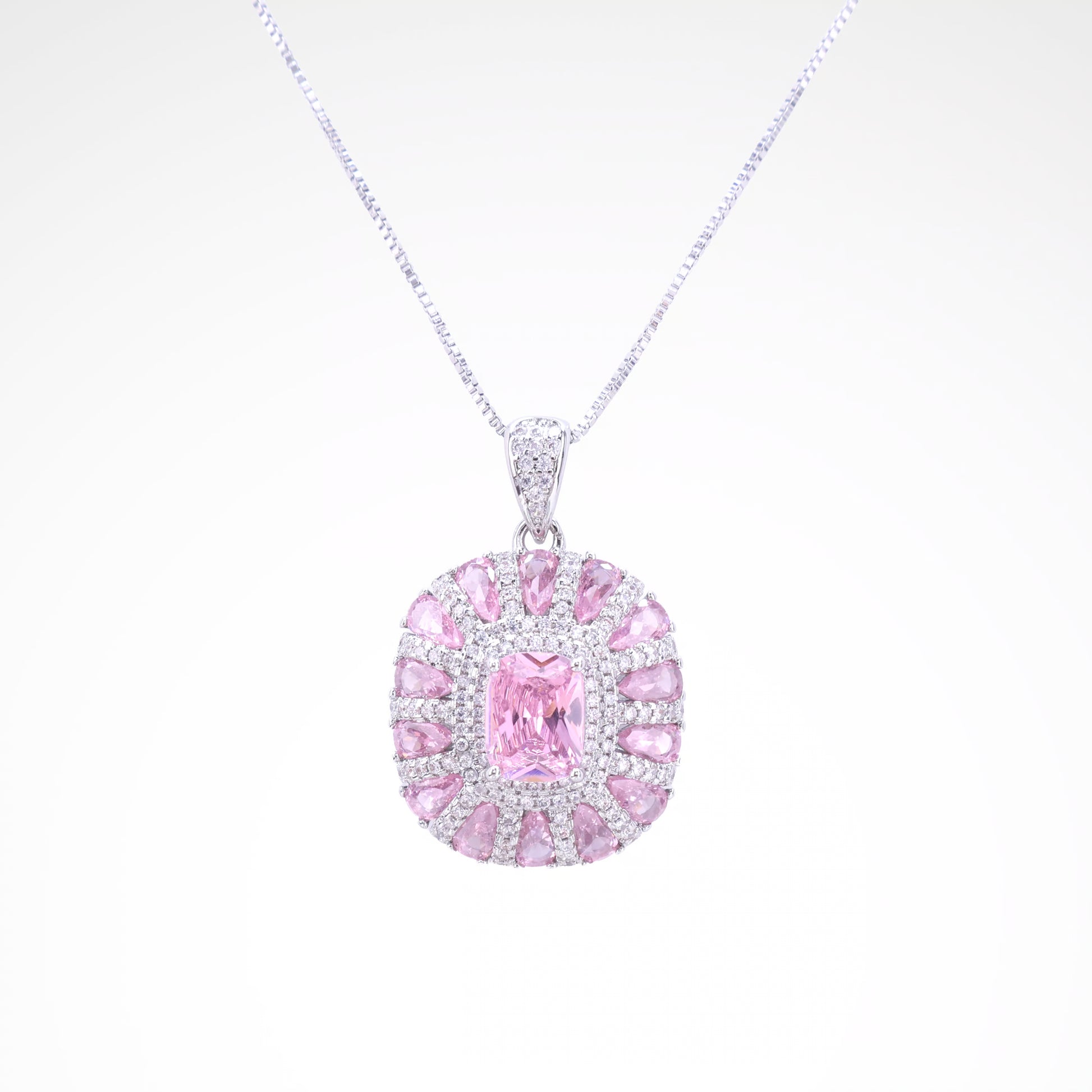 A radiant cushion-cut pink crystal anchors the design, its soft facets releasing a gentle rosy luminescence. Encircling it, a lavish ring of pear and round pink crystals blends seamlessly into a sparkling halo of clear pavé stones, creating layered depth and endless brilliance. Suspended from a refined silver-tone chain with an elegant bail adorned in matching sparkle, this pendant offers a harmonious balance of color and light, resting beautifully against the skin with quiet sophistication and captivating allure.