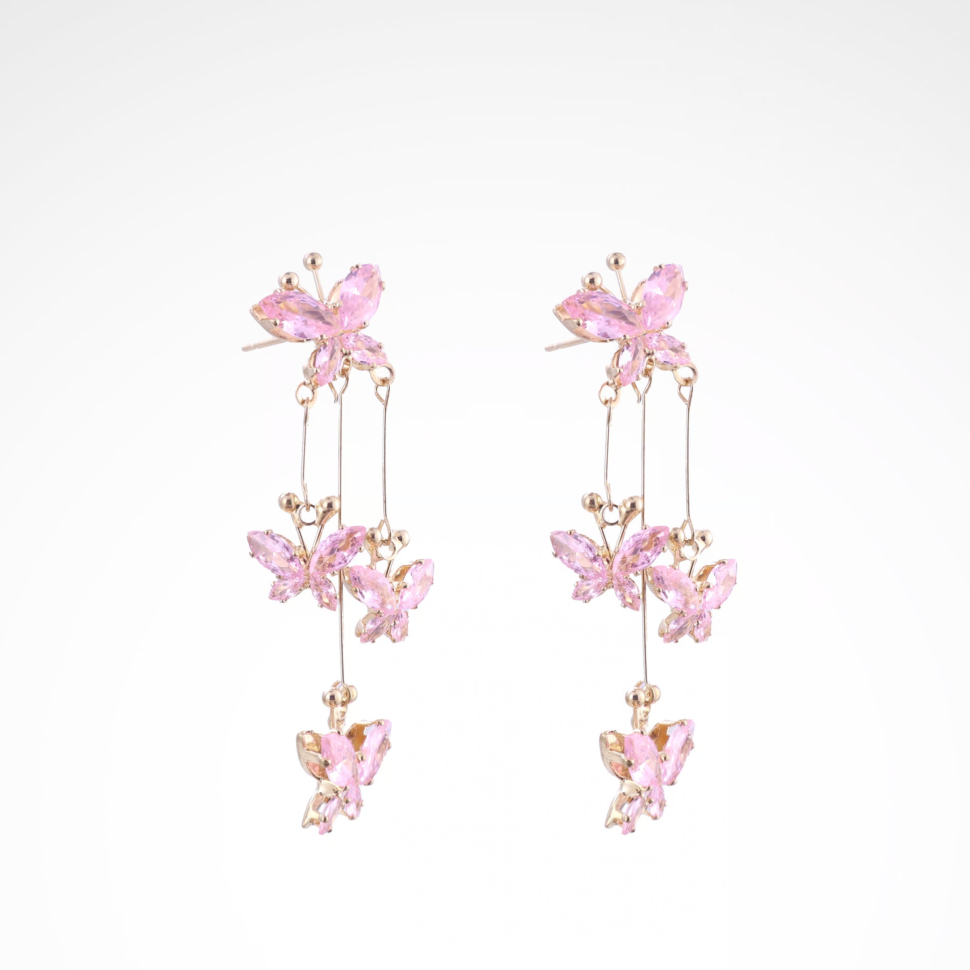 Delicate butterflies crafted from shimmering pink crystals flutter along slender gold chains, creating a mesmerizing cascade that dances with every movement. The design features three graduated butterfly motifs on each earring, connected by fine links and adorned with tiny gold accents that catch the light beautifully. These statement drop earrings bring a whimsical yet refined touch to any ensemble, perfect for adding a soft, feminine glow to evening looks or elevating daytime style with subtle sparkle.