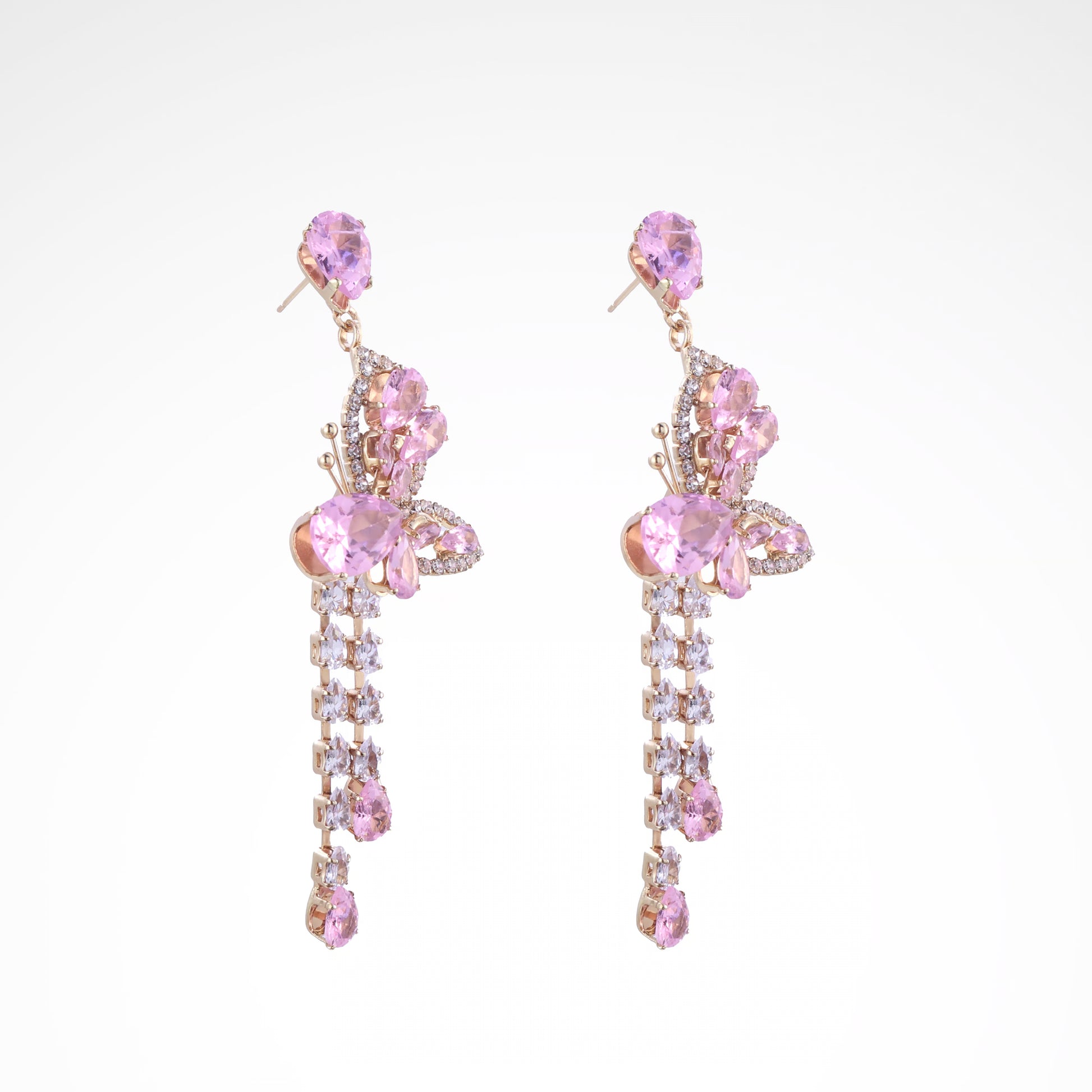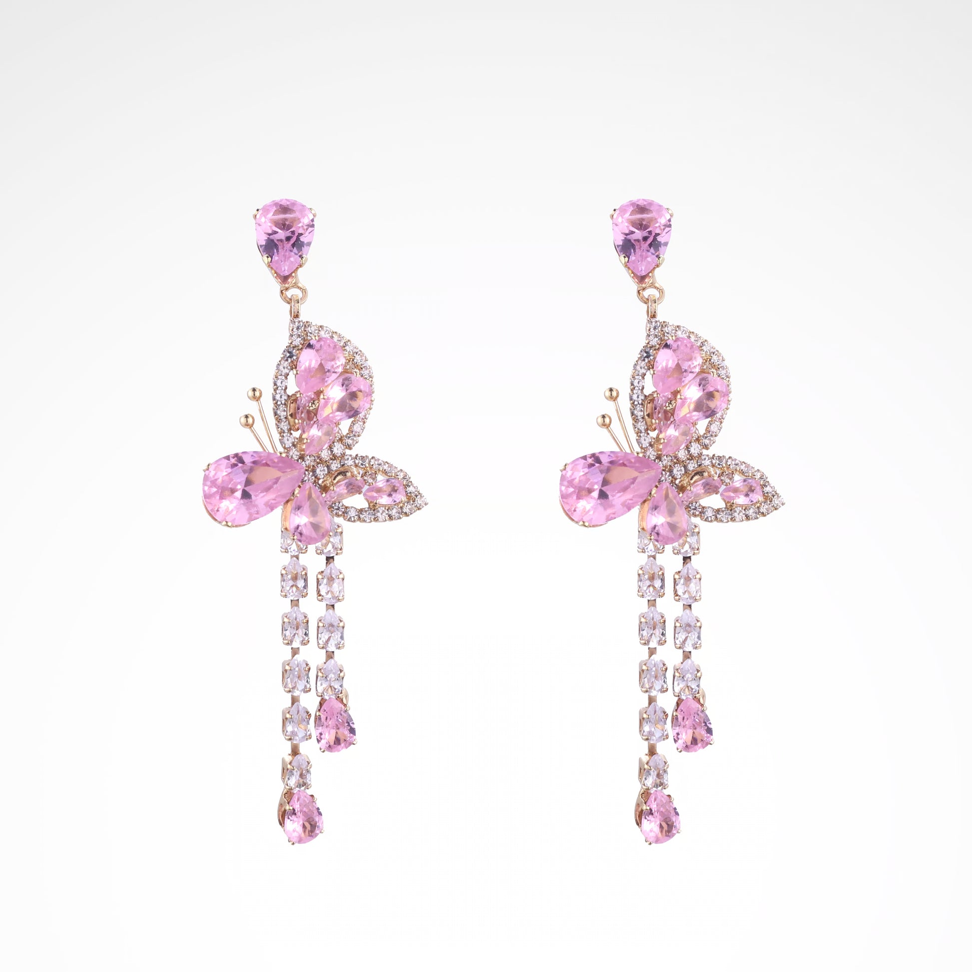 A captivating butterfly takes center stage, its wings formed from radiant pink crystals framed in warm gold and accented with pavé sparkle. From this enchanting focal point, slender tassels cascade downward, alternating soft pink heart-shaped crystals with brilliant clear stones that sway gracefully with every turn. The elongated design creates a fluid, mesmerizing movement, blending whimsical charm with timeless sophistication for an unforgettable statement piece.